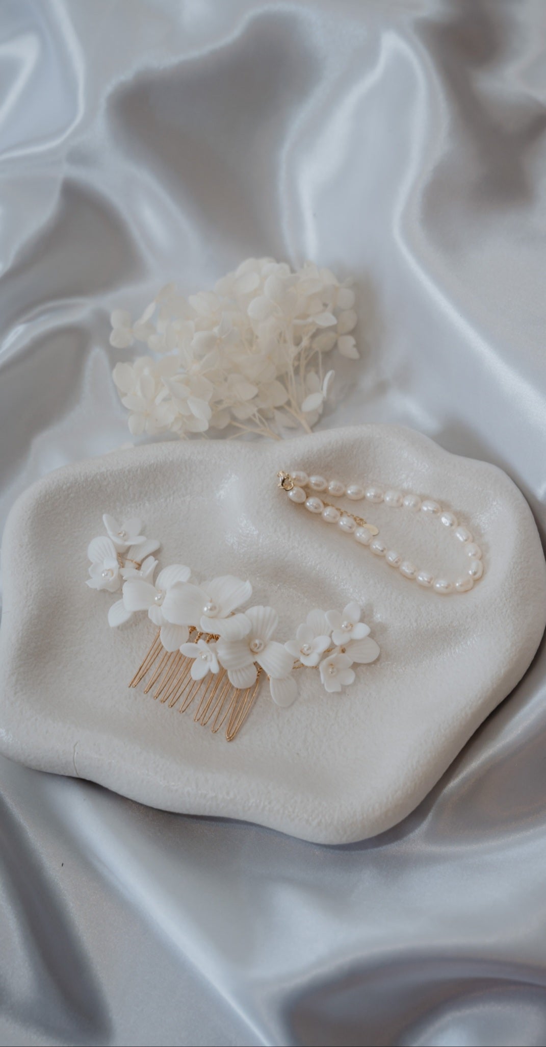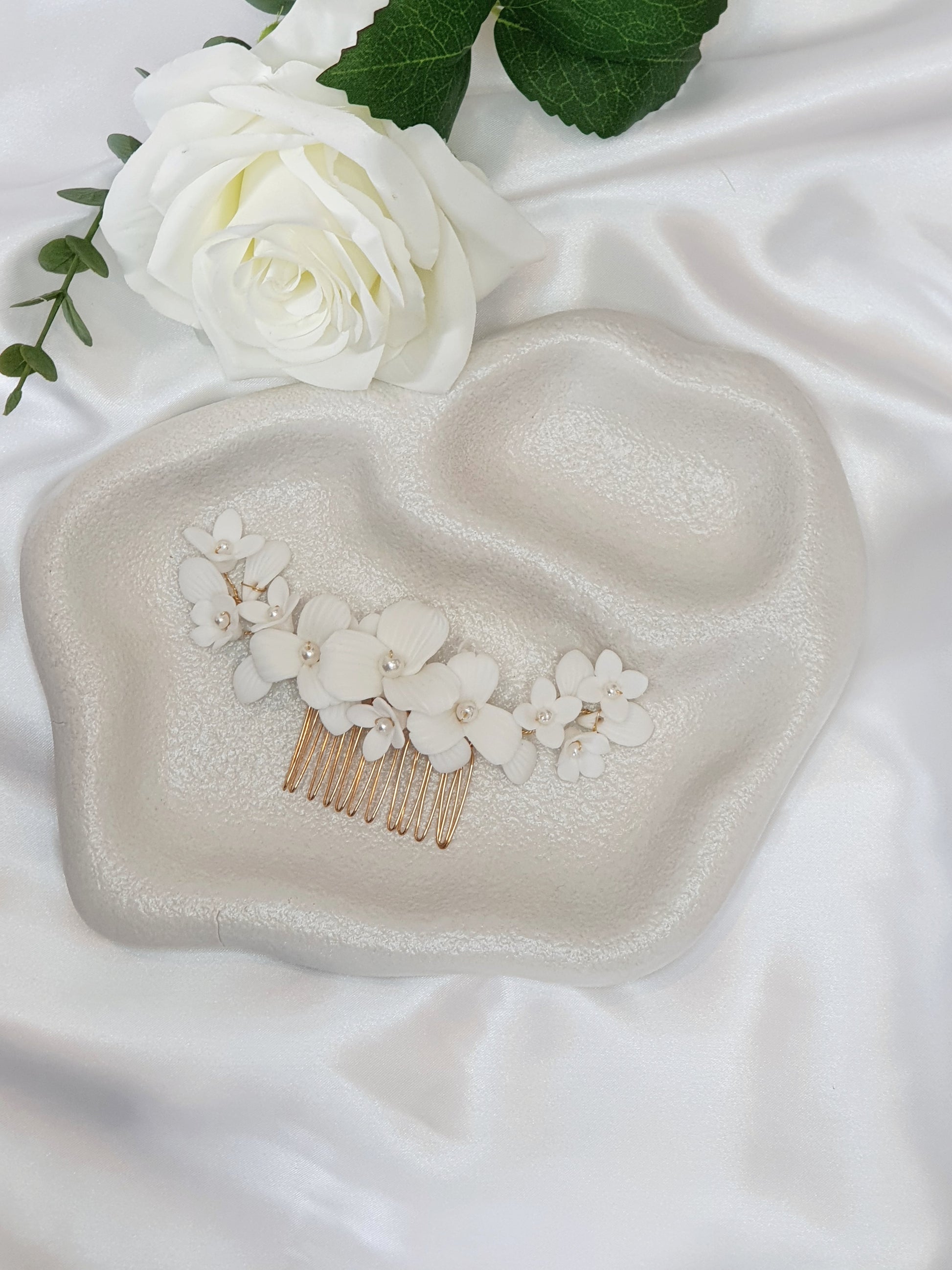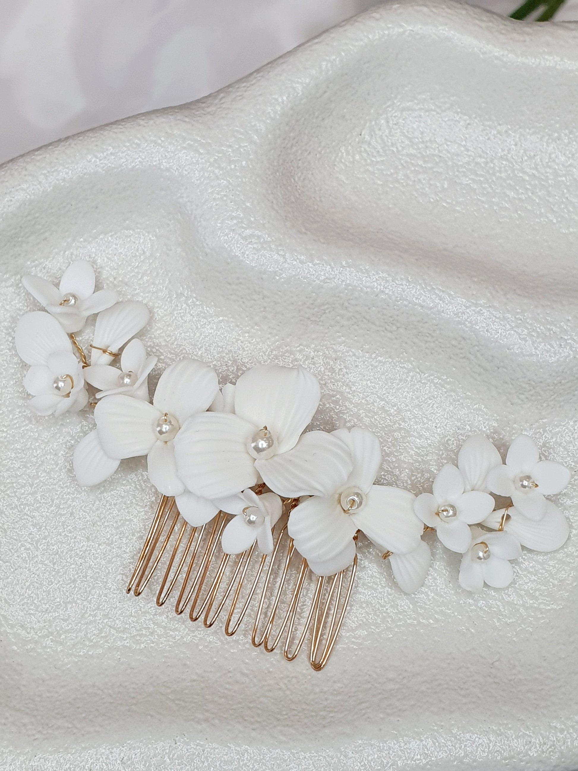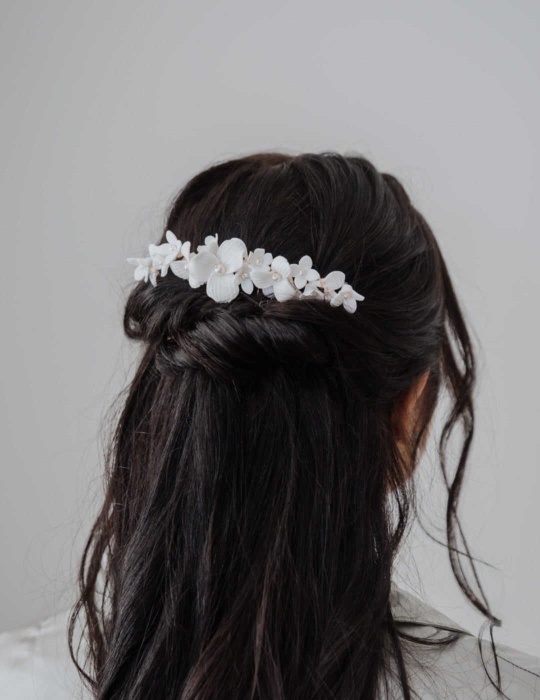 Delicate handcrafted porcelain flowers woven onto a comb with ultra fine wire, to give you an elegant and soft hair look.